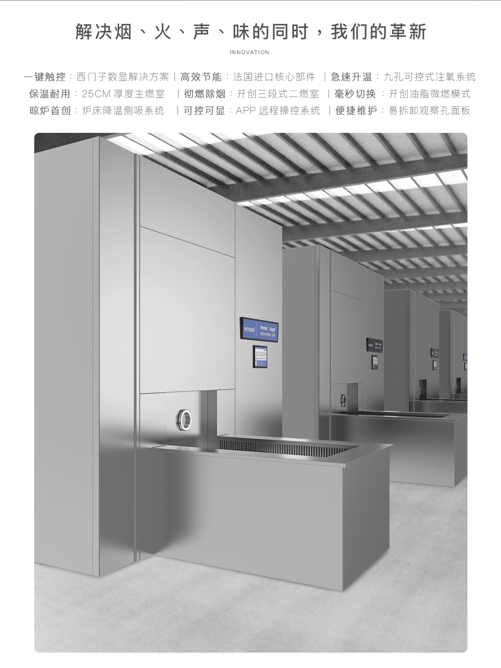 宠物火化系统由在西门子提供数字化解决方案,区别于国内传统的手推式,我们采用面板数控式入炉闭门方案,通过炉膛内的传感设备,数显感知炉温及炉压。天眼系统能让宠物主在任何地点都能看到宠物入炉的实时场景和排放系统的稳定性。新风系统和储能设备一体化设计,彻底改变善后场所脏乱差的问题。