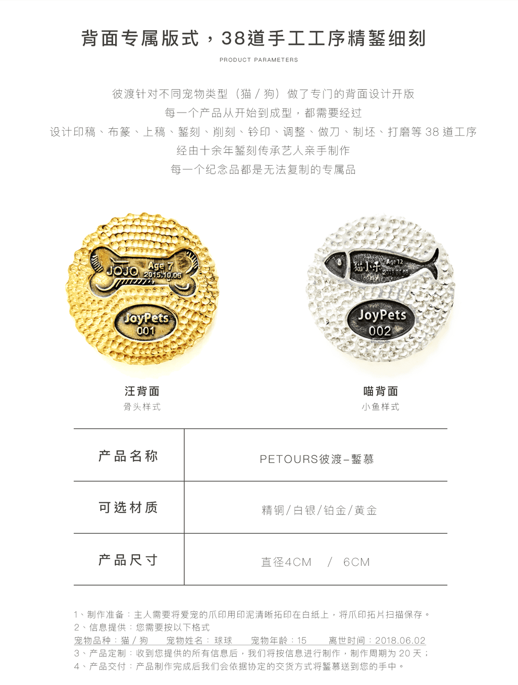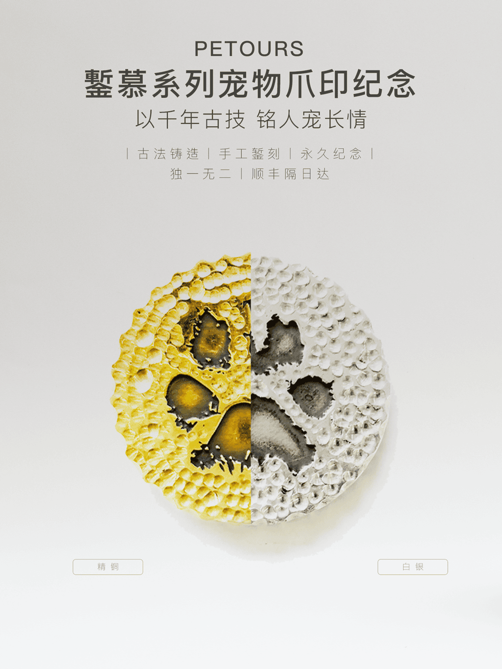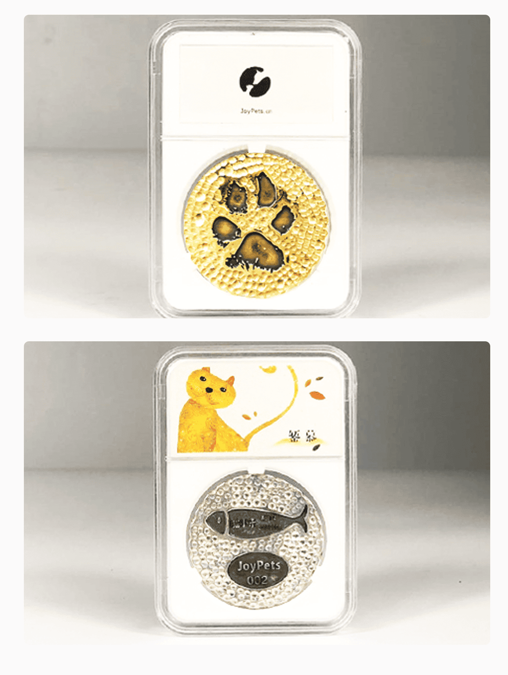款别具特色的爪印纪念币,为您的宠物提供了一种独特而珍贵的纪念方式。鏨慕的特点在于其定制化的设计,将您宠物的爪印永久铭刻在纪念币的前部,以此永远纪念您与宠物之间深厚的情感纽带。